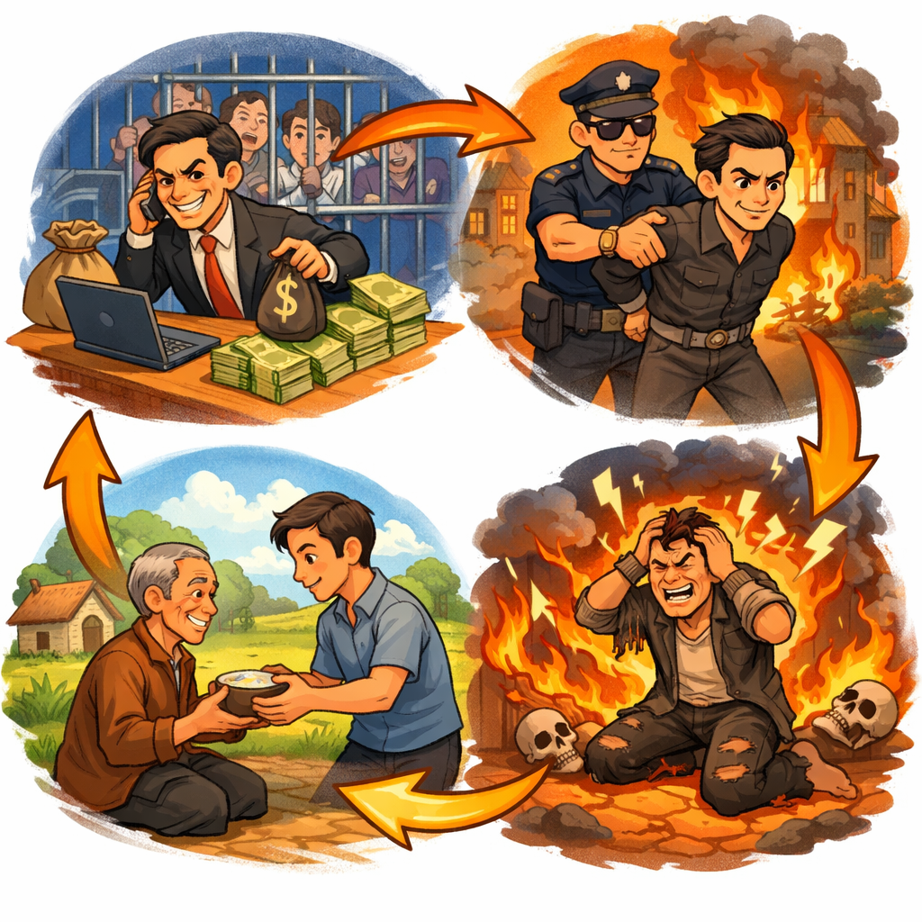 Đức Phật dạy rằng khi lòng tham dẫn dắt hành động, con người sẽ tạo nghiệp đưa đến khổ đau. Trường hợp này, nghiệp quả không đến dưới hình thức siêu hình, mà hiện rõ qua lạm phát, nghèo đói và bất ổn xã hội.